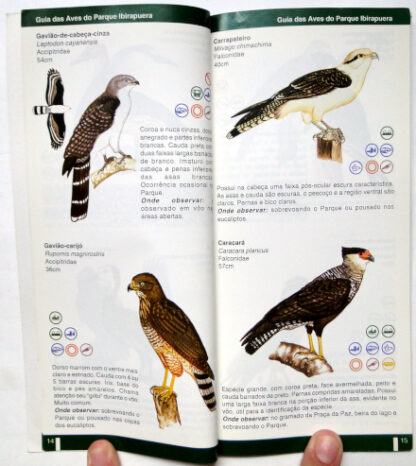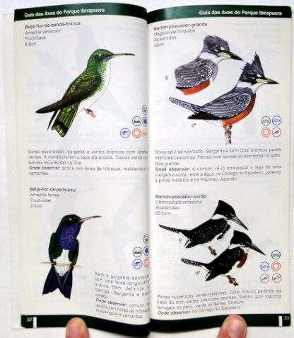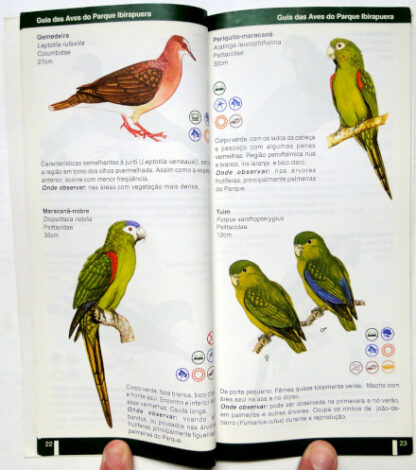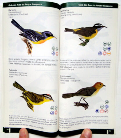 Este guia traz informações sobre a biologia, ecologia e local de observação de 120 espécies de aves registradas no Parque Ibirapuera. O livro encontra-se em bom estado de conservação com leves desgastes na capa.
