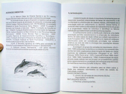 Este livreto traz informações sobre Métodos para determinação de idade em Cetáceos Odontocetos: Histologia e fisiologia dos dentes de cetáceos; Coleta de amostras para determinação de idade; Técnicas de preparação aplicadas aos dentes para determinação de idade; Análise de dados. Livreto encontra-se em bom estado de conservação, com leves desgastes na capa.