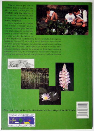 Este livro traz informações sobre: A construção – aspectos técnicos; Introdução das plantas no laguinho; Introdução dos peixes; O ecossistema de água doce; As espécies de plantas; Manejo do laguinho. O livro encontra-se em ótimo estado de conservação, sem sinais de uso, com leve amarelamento das páginas, devido a ação do tempo.