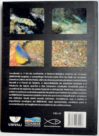 Este livro traz informações sobre: Reserva Biológica Marinha do Arvoredo; Peixes recifais: sinopse da sua ecologia; Adaptações biológicas dos peixes recifais; Peixes: sistemática e ocupação do costão rochoso; Espécies ameaçadas; Espécies de peixes da REBIOMAR; Traz informações sobre a biologia, ecologia e distribuição geográfica de 85 espécies de peixes. O livro encontra-se em bom estado de conservação com leves desgastes na capa e leve amarelamento das bordas das páginas.